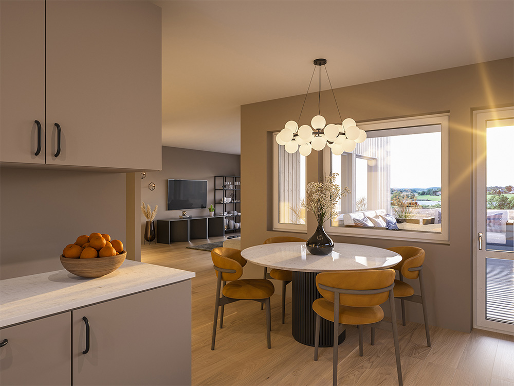 2 moderne vertikaldelte tomannsboliger med fantastisk utsikt og solforhold – like innbydende som de er praktiske.